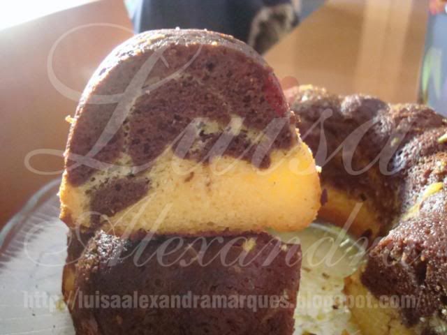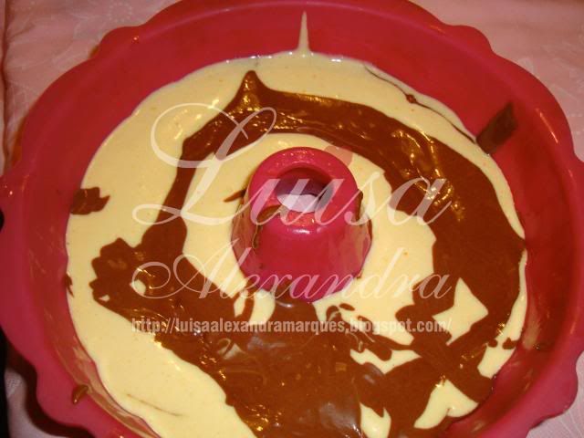 Numa forma de silicone ir deitando um pouco da massa de laranja, seguidamente um pouco da massa de cacau, até terminar.