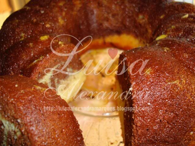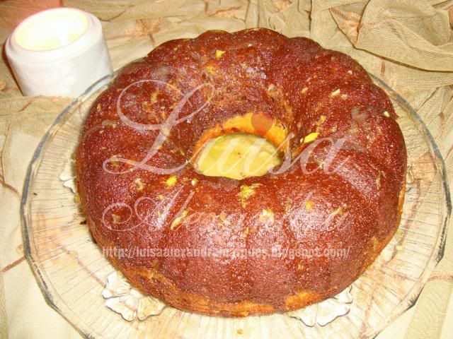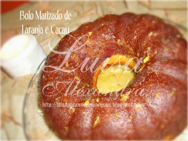 Fazer uma calda com o sumo da laranja e uma colher (de sopa) de açúcar, fervido no microondas, e deitar por cima do bolo já desenformado.